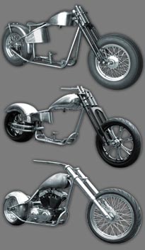 Motorcycle Frames available from stock tire width to the massive 360 tire frames. Each frame is made in-house to our exacting specifications, and are available with the most popular configurations. Or, for a small additional charge, you can spec your own frame to meet your needs.